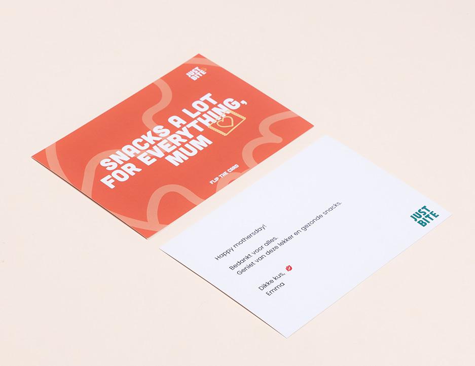 In elke box vind je een kaartje met jouw persoonlijke boodschap en logo, een weetje over gezonder snacken en een verwijzing naar het goede doel dat jij steunt door deze box te bestellen.