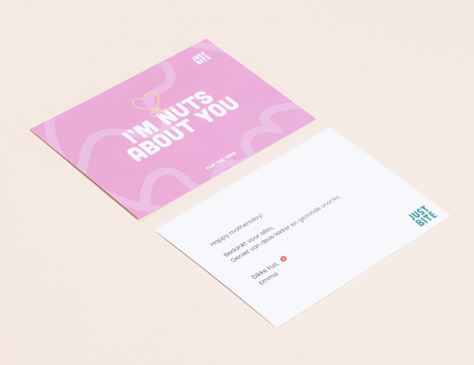 In elke box vind je een kaartje met jouw persoonlijke boodschap, een weetje over gezonder snacken en een kaartje met informatie over het goede doel dat jij steunt door deze box te bestellen.