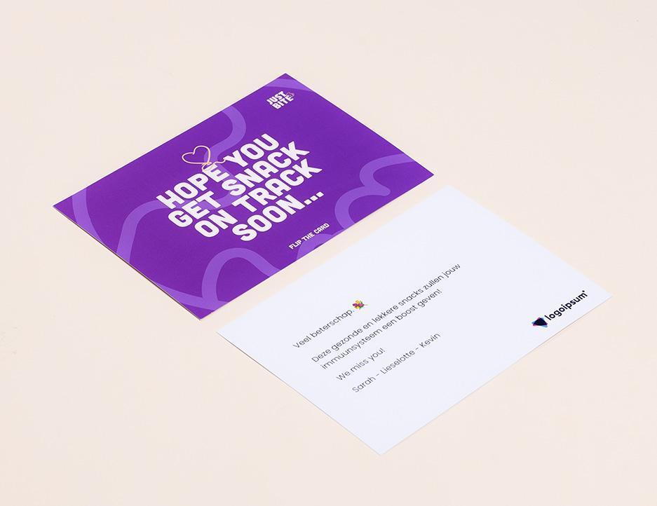 In elke box vind je een kaartje met jouw persoonlijke boodschap en logo, een weetje over gezonder snacken en een verwijzing naar het goede doel dat jij steunt door deze box te bestellen.