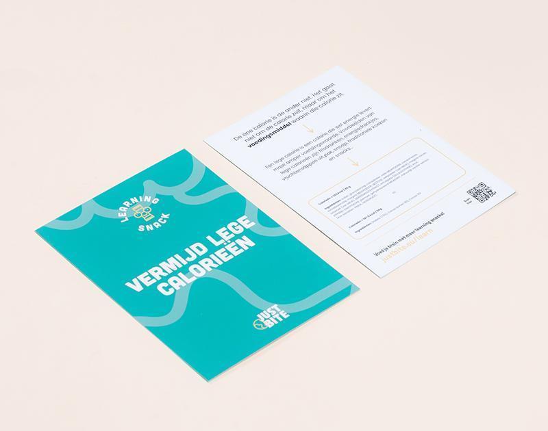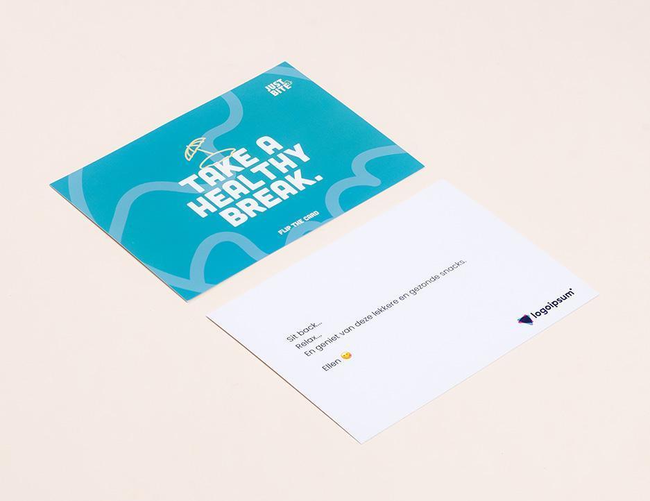 In elke box vind je een kaartje met jouw persoonlijke boodschap en logo, een weetje over gezonder snacken en een verwijzing naar het goede doel dat jij steunt door deze box te bestellen.
